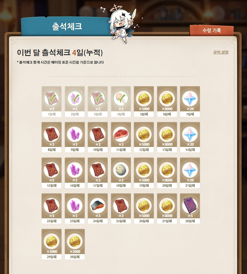 출석 체크는 한달마다 리셋이 되기 때문에 까먹지 않고 출석을 해주시는 것이 좋습니다. 혹시 저처럼 모르고 계셨던 분이 계시면. 7가지 원소가 살아 숨 쉬는 판타지 세계 티바트.