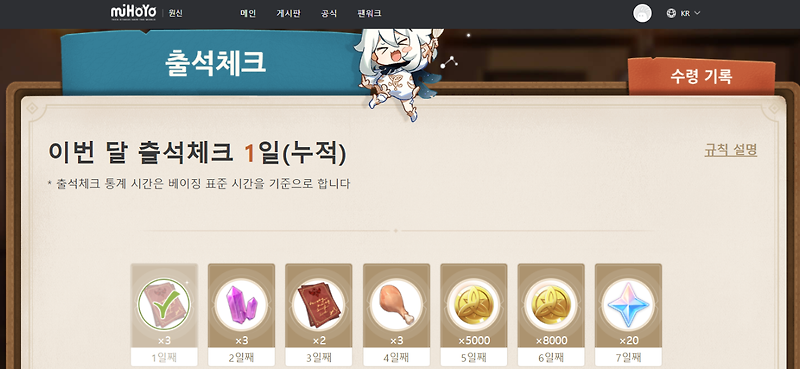 매일 출석 체크 기능 오픈. 원신은 출석체크를 게임 내에서가 아닌 웹 홈페이지에서 할 수 있습니다. 필자는 이미 한번 받아서 2일째 보상을 받았다.